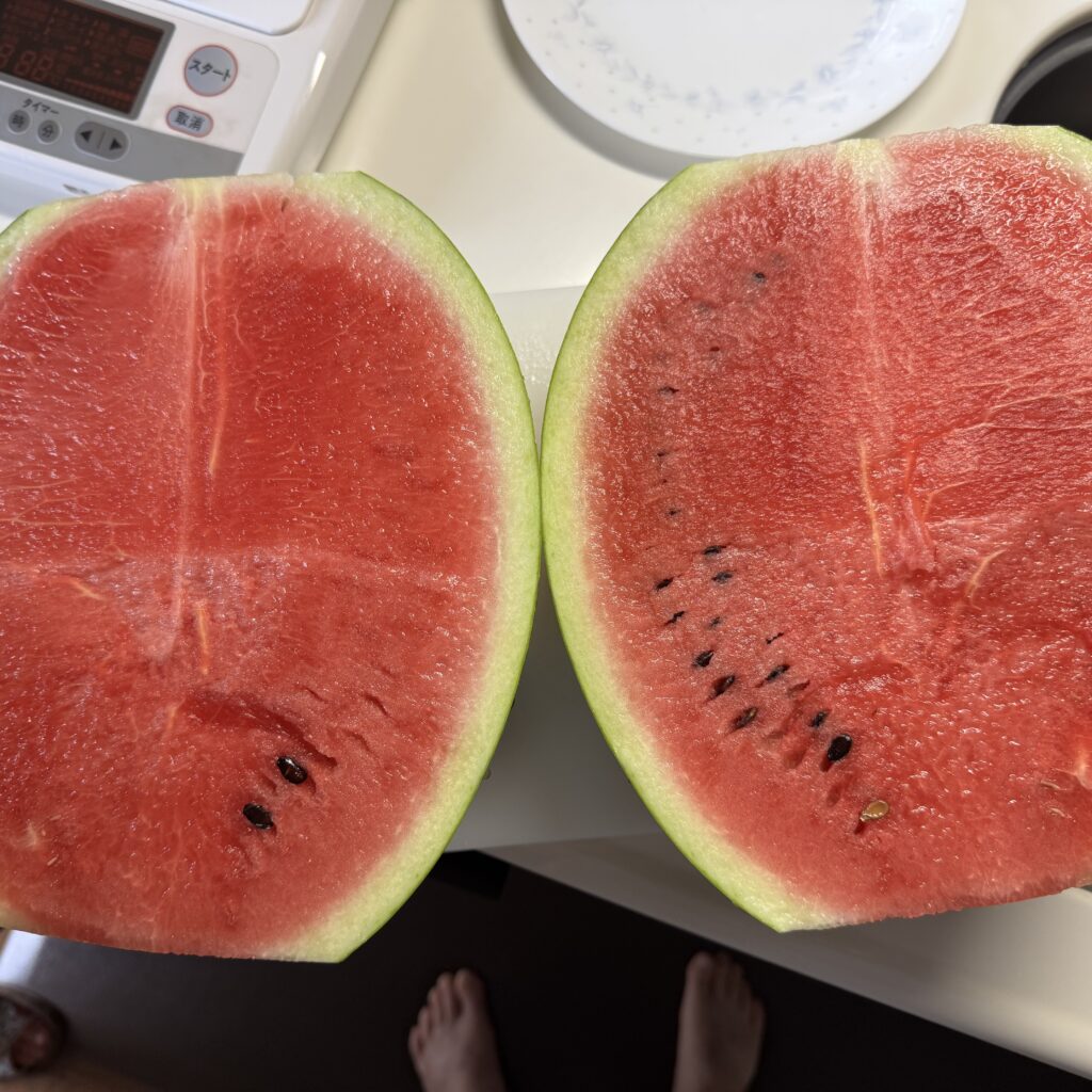 まあまあかな~。食べてみると、甘くて、瑞々しくて、美味し~い! これでスイカの食べおさめになるのは悲しいです。また、来年楽しみにしています。